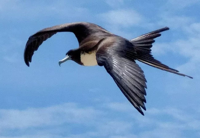 军舰鸟是生活在热带地区的一种鸟类,它的外形长的花纹特别的漂亮。飞行的速度大约有150千米,这种鸟她特别的聪明,有心机,它比较喜欢暗中去袭击自己的猎物。它还有一个很大很独特的本领就是滑翔。
