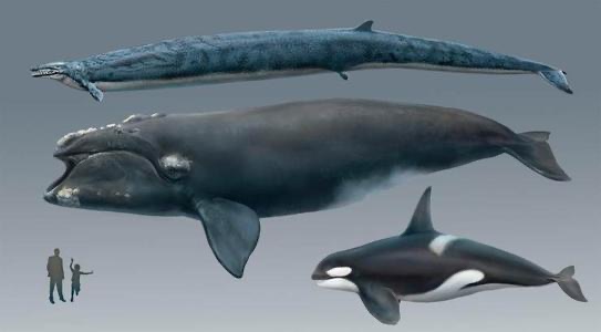龙王鲸 与现代鲸鱼的对照, 龙王鲸是现代鲸鱼的祖先,可以生长到 15-20 米长,甚至更大。龙王鲸的体型修长,有点像在海洋中的巨蟒。