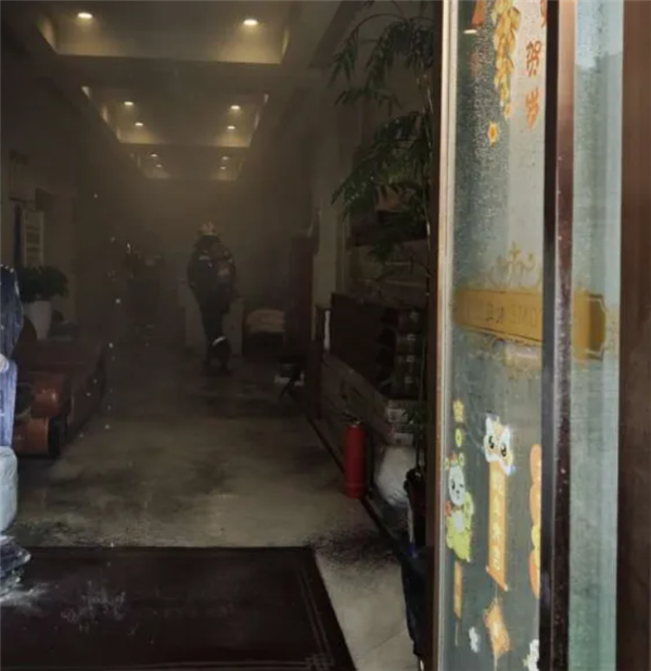 所幸火势未进一步蔓延,未造成人员伤亡,但大厅内部分物品已被烧毁,留下明显灼烧痕迹。