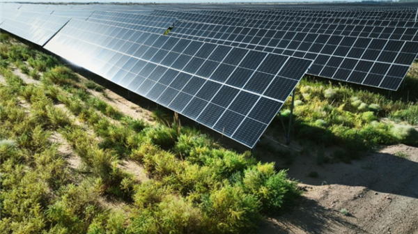而光伏板也约等于一把巨大的遮阳伞,降低地表温度、减少土壤水分蒸发的同时,光伏板还能在一定程度上削弱风速,让沙土没那么容易被吹走,也就给光伏板下的植物有了生长环境。