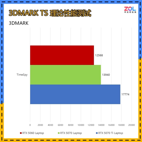 首先是理论性能测试,测试软件为3DMARK。在代表DX12性能的Time Spy中,具体成绩如下。性能提升方面,移动版RTX 5070相比移动版RTX 5060提升10.9%,这个幅度大家不会陌生,RTX40系中的50、60、70之间的提升幅度就是10%左右。而移动版RTX 5070Ti相比移动版RTX 5070,提升幅度来到27.5%,明显拉开了性能差距。
