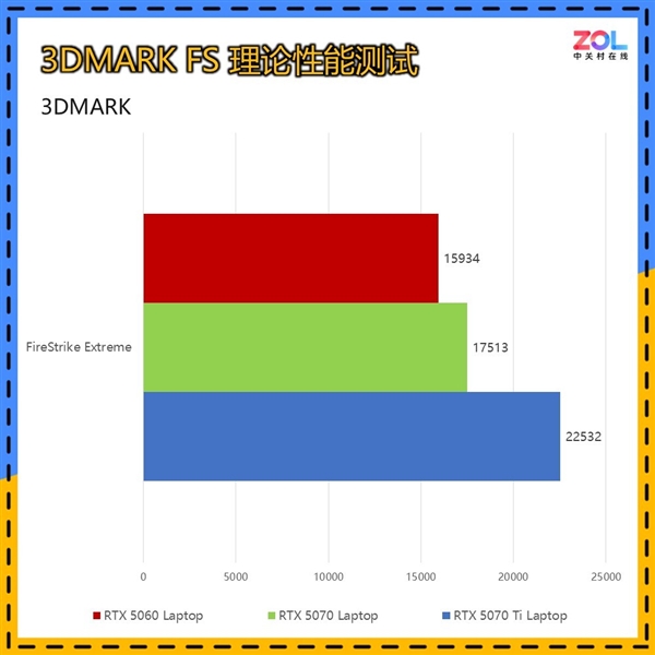 在代表DX11性能的Fire Strike Extreme中,具体成绩如下。性能提升方面与上一项测试成绩非常接近,移动版RTX 5070相比移动版RTX 5060提升9.9%,而移动版RTX 5070Ti相比移动版RTX 5070提升幅度来到28.7%,移动版RTX 5070Ti有着明显的性能领先。