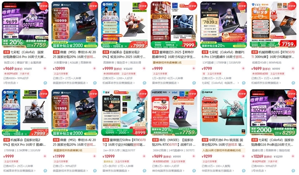 售价在万元以内的游戏本,当然这里提到的价格是国补之后的,基本都是搭载移动版RTX 5060、RTX 5070和RTX 5070Ti三个显卡型号,其中搭载前两款型号的最多。