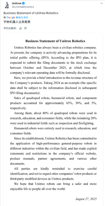 9月2日消息,据媒体报道,今日,宇树科技在社交平台X发文披露机器人业务声明称,公司一直是一家民用机器人公司,根据IPO计划,将在今年10月至12月之间提交上市文件,届时将披露相关运营数据。