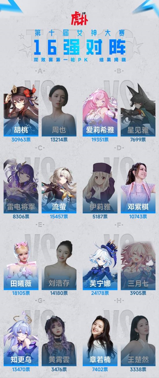 在瑞士轮、双败赛阶段击败超人气选手田曦薇、爱莉希雅。并在决赛赛段击败胡桃,成功加冕,成为首位登顶女神大赛的二次元女神!