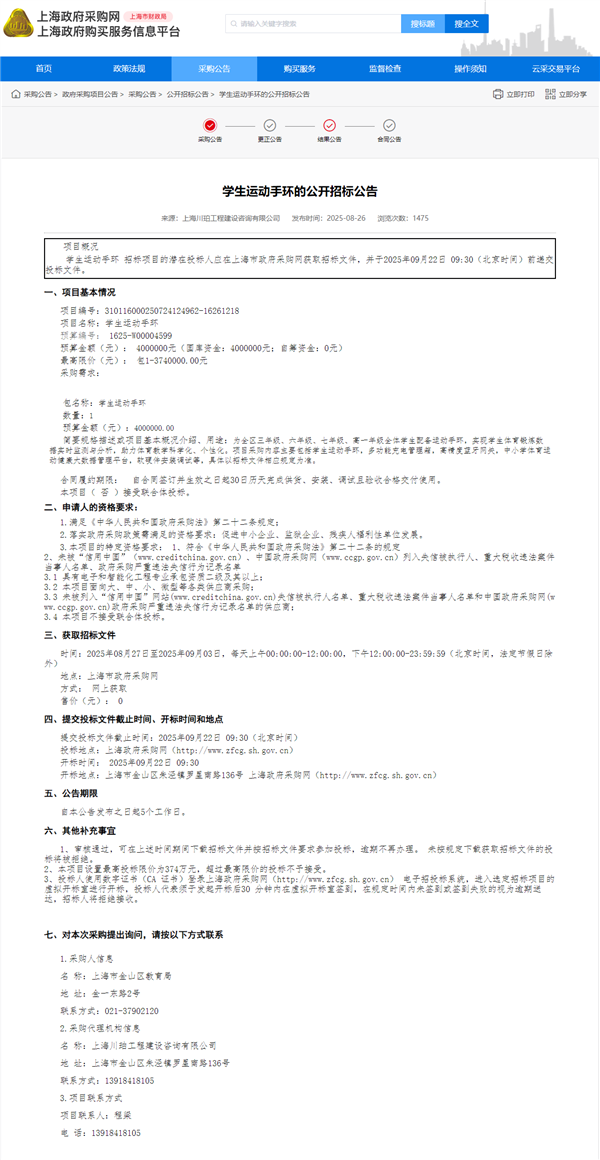 9月2日消息,昨日,上海政府采购网出现一则学生运动手环的终止公告。