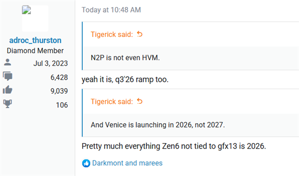 还有消息称,台积电N2P工艺将在2026年第三季度实现量产,这意味着最早可能在2026年第四季度或第三季度末看到基于Zen 6架构的下一代锐龙CPU。
