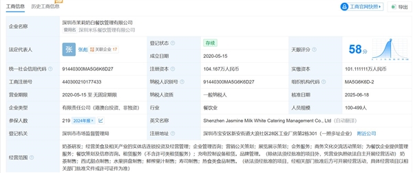 天眼查显示,茉莉奶白关联公司深圳市茉莉奶白餐饮管理有限公司成立于2020年5月,法定代表人为张彪,注册资本约104万元,由深圳市茉莉奶白控股有限公司、FRAGRANT TEA LIMITED共同持股。