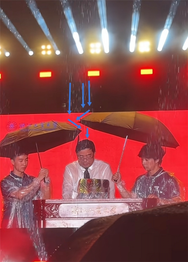 令人忍俊不禁的是,两把雨伞的遮挡范围未能完全衔接,恰好将校长头部位置留出空隙,雨水顺着空隙落在校长身上“精准浇头”,现场氛围既诙谐又温馨。