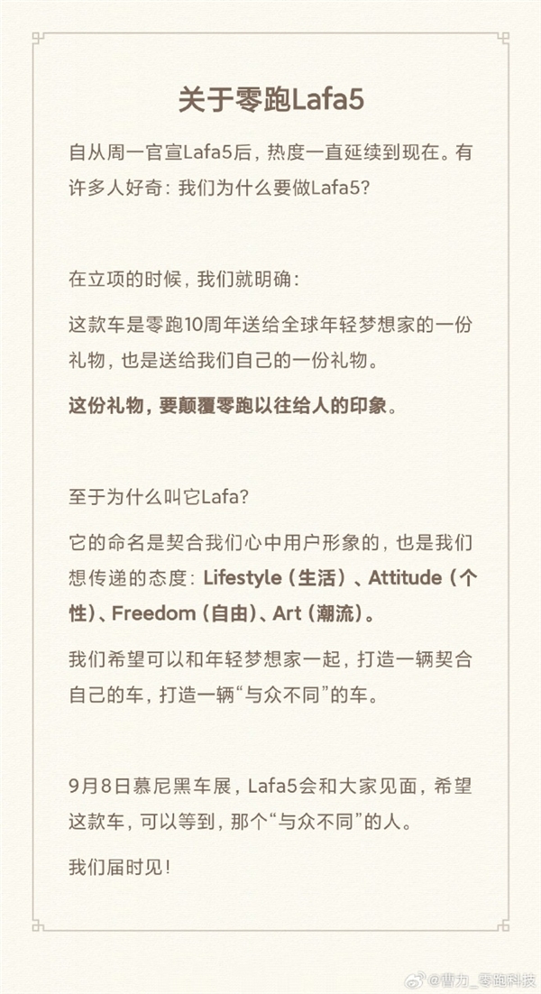 关于Lafa5的命名,曹力表示,它的命名是契合零跑心中用户形象的,也是零跑想传递的态度:Lifestyle(生活方式)、Attitude(个性态度)、Freedom(自由掌控)、Art(潮流审美)。
