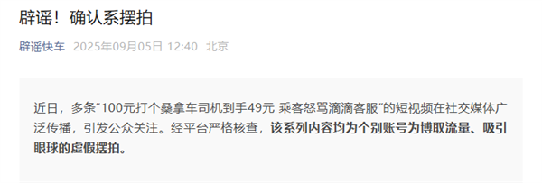 9月5日消息,今日,认证主体为“滴滴出行(北京)网络平台技术有限公司”的公众号“辟谣快车”发文,对网络传播的多条“100元打个桑拿车司机到手49元 乘客怒骂滴滴客服”的短视频进行辟谣。