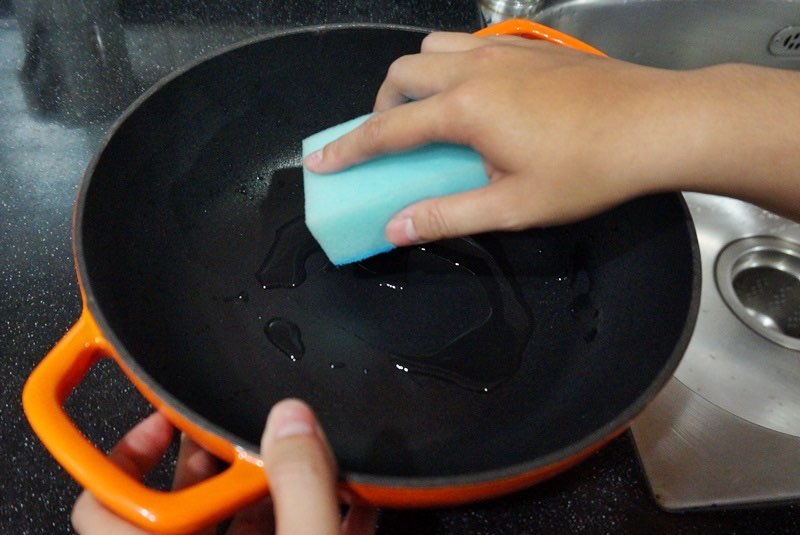 比起铸铁锅,珐琅锅较不需要花费时间养锅,平常以海绵搭配中性清洁剂清洗,再用干布擦干,将锅盖、锅身分开收纳于干燥通风处。