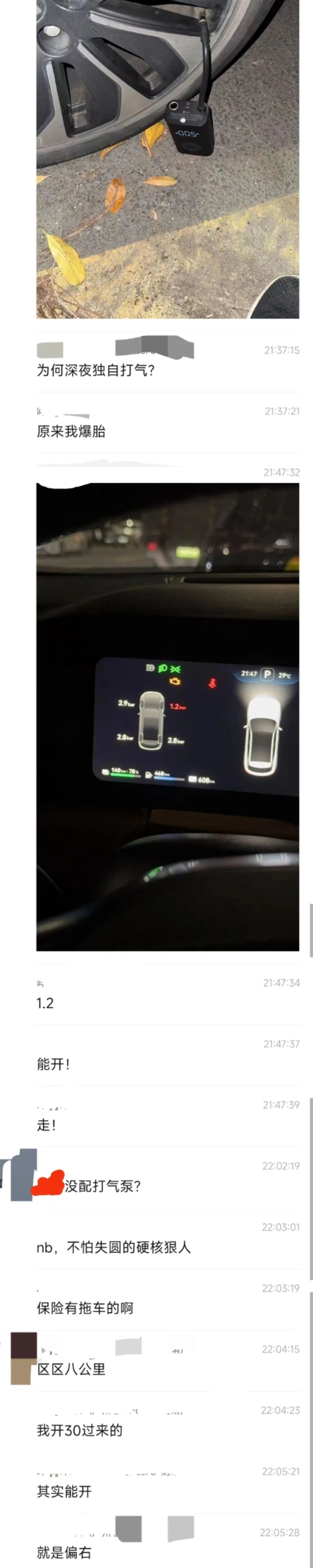 我身边就有这么一位买了二手新能源的极品朋友,爆胎之后他不想报保险,想撑到附近的修车铺。但由于不是新车,所以他后备箱的补胎液和打气泵已经被薅走,只能自己拿打气泵充点意思意思。硬顶着 1.2bar 的胎压开了过去。。。