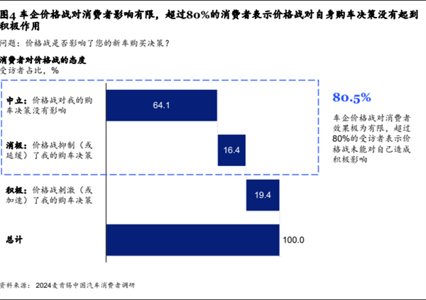 这并不是臆测,2024 麦肯锡中国汽车消费者洞察报告显示,超过 80% 的消费者表示价格战对自身购车决策未起到积极作用。也就是说,降价未能有效促销,车市的观望情绪本身就很严重。