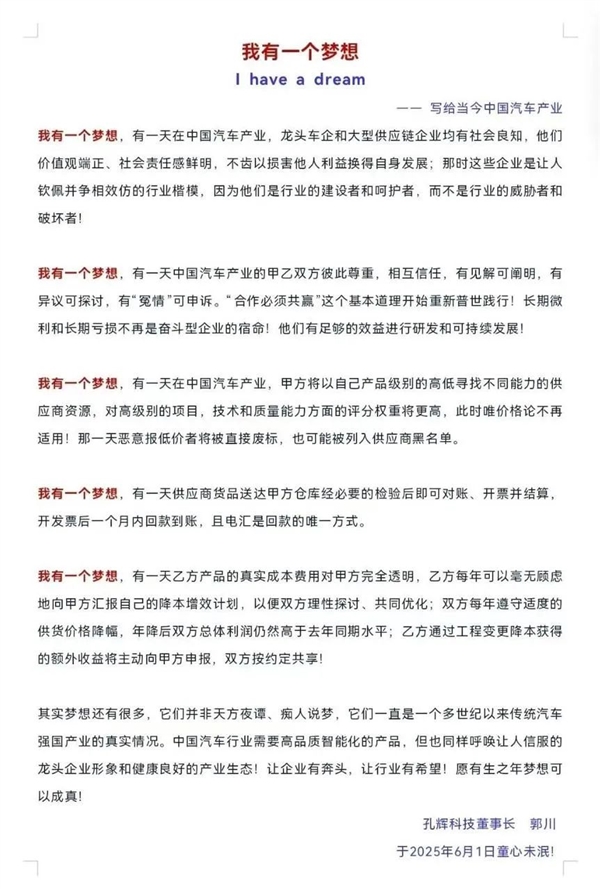 刚过去的 6.1 儿童节,孔辉科技董事长郭川发表了文章《我有一个梦想》,其中提到了共赢、质量、账期、降本等多个甲乙方核心矛盾。
