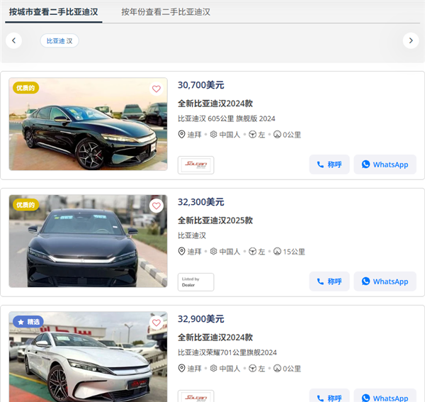 就比如这台阿联酋的比亚迪汉,官方卖 199900 阿联酋迪拉姆(折合人民币 39.2 万),而当地的 0 公里二手车则是 3 万多美元(折合人民币 22 万左右)。