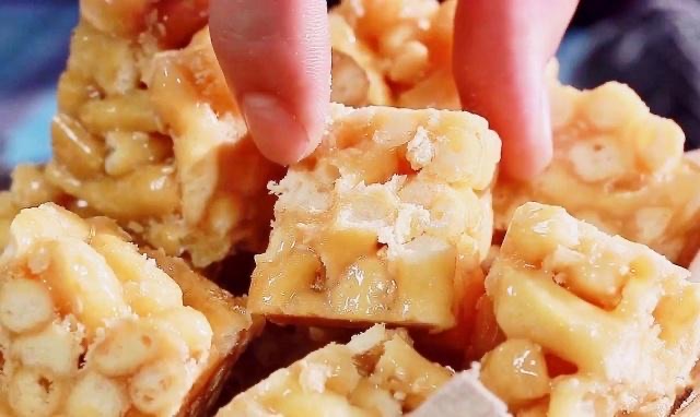 This soft and sweet dessert can be found easily in supermarkets and bakeries. Strips of dough paste are fried until they reach a yellowish color, then are mixed with syrup, which holds them together, and cut into cubes when cold. 这款软糖甜品在超市和糕点店里很常见。条状的面粉被炸至浅黄色,然后与糖浆混合拌匀,黏在一起后,待冷却切块即可。