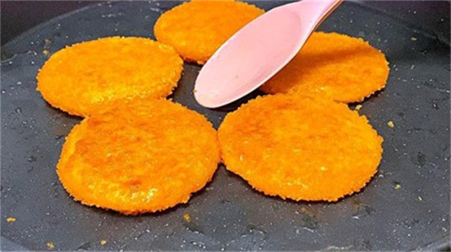 6.将搓好的红薯饼放入油锅中,两面煎至金黄色,直至熟透。