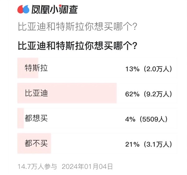 1月4日消息,日前,有媒体针对“比亚迪和特斯拉你想买哪个?”做了一个调查,截至发稿,有近15万人参与,其中,超60%网友选择买比亚迪。