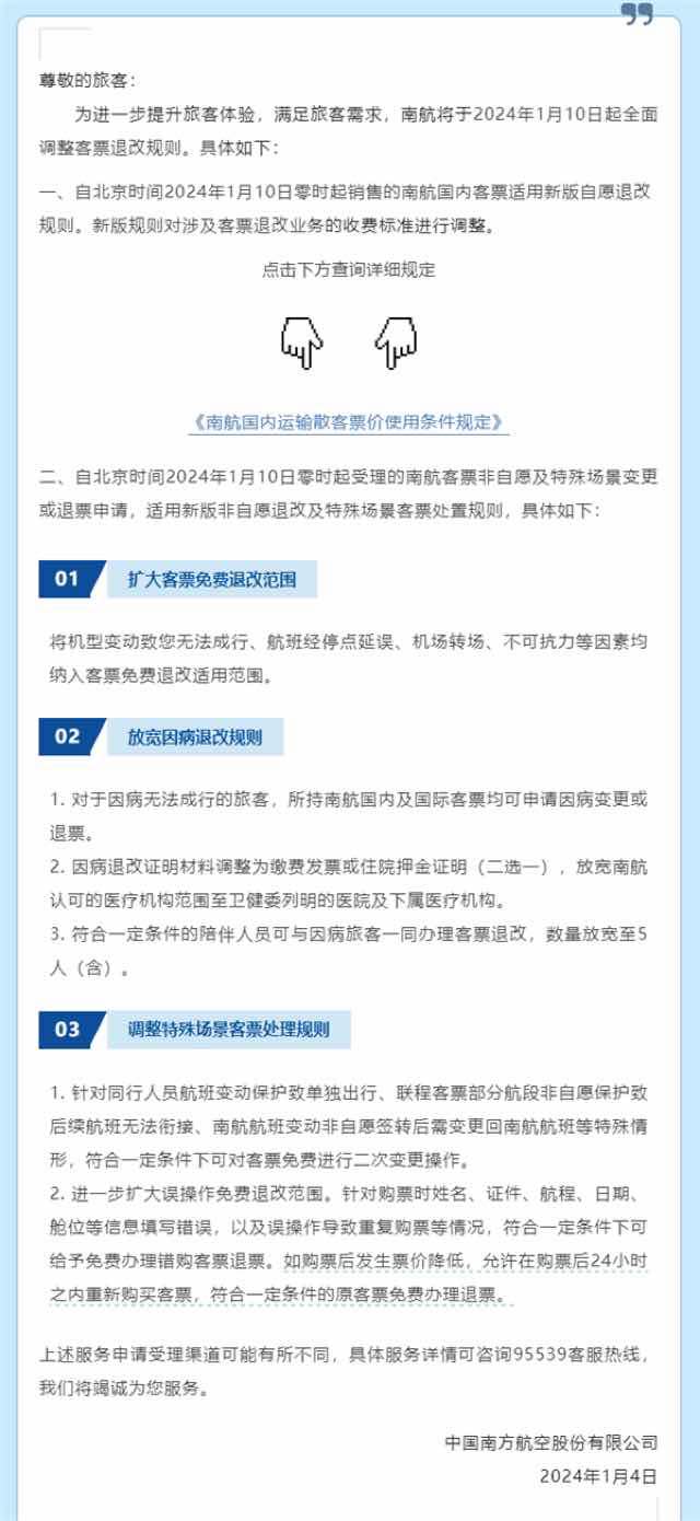 官方表示,自北京时间2024年1月10日零时起销售的南航国内客票适用新版自愿退改规则。