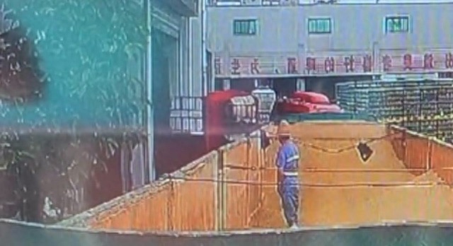 这个工人的动作相当之娴熟,一站到地上,左看右看没有人之后,直接拉开拉链,毫不犹豫的在这一个存放原料的仓内小便。