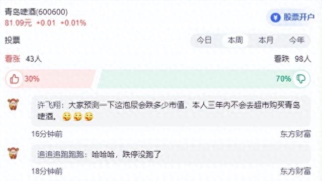 部分网友更是在网络上直接笑开花,等着看青岛啤酒的股票会跌多少,投票比例自从视频曝光之后,更是达到了三比七。
