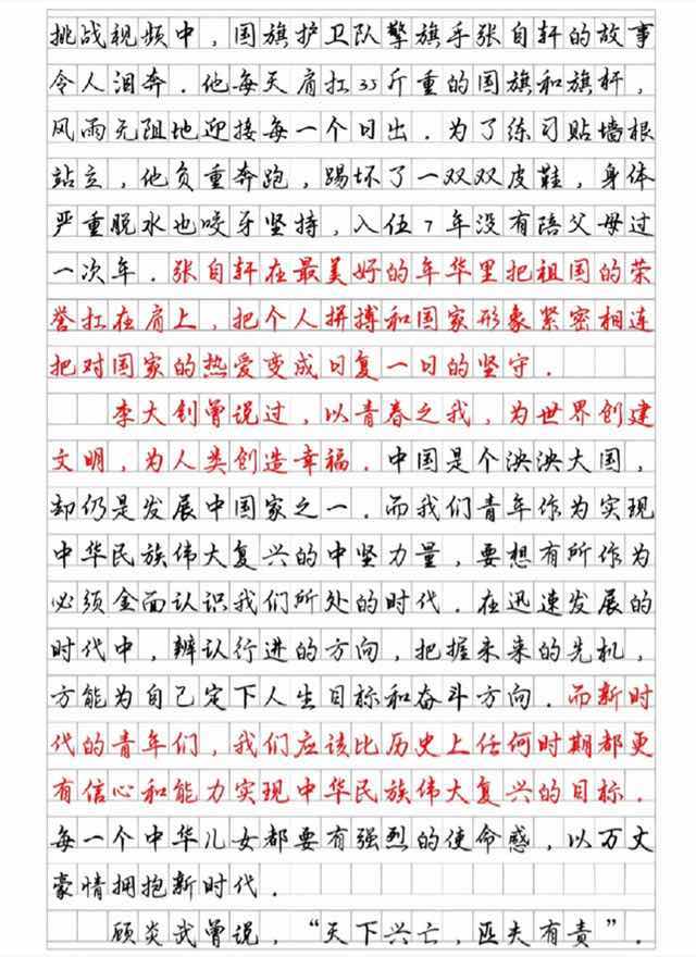 尾段总结全文,再次点明文章主旨,与首段相呼应,上升高度,通篇来看这篇文章,递进式写作,从心中有国家到行动上应该为国家作贡献再到如何行动,结构完整,层次分明,内容紧凑,文笔出彩,多引用名人名言,可见考生的文化素养,这是一篇非常不错的文章。