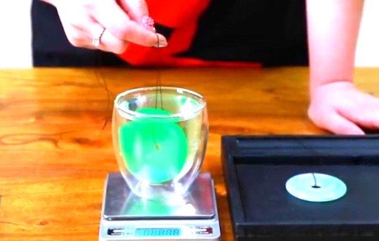 4、将带有线的翡翠松手放进水杯中,记录这个时候的重量。