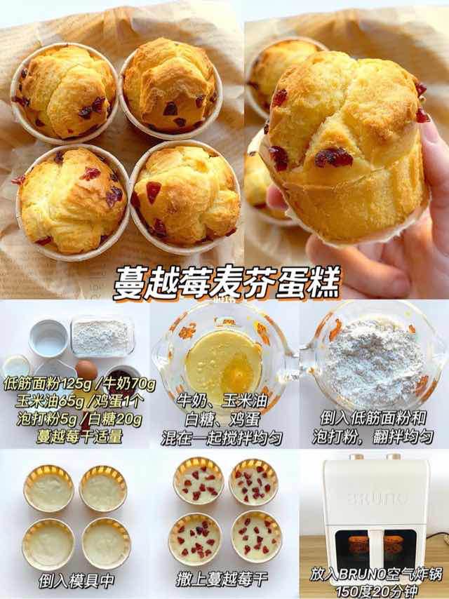 ✨食材:低筋面粉125克 、牛奶70克、玉米油65g克、鸡蛋1个、泡打粉5克 、白糖20克、蔓越莓干适量