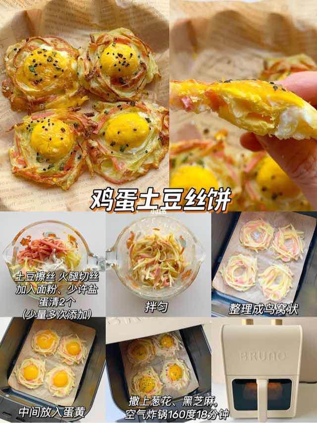 ✨食材:土豆丝、火腿丝、面粉适量、盐少许、蛋清2个、蛋黄4个