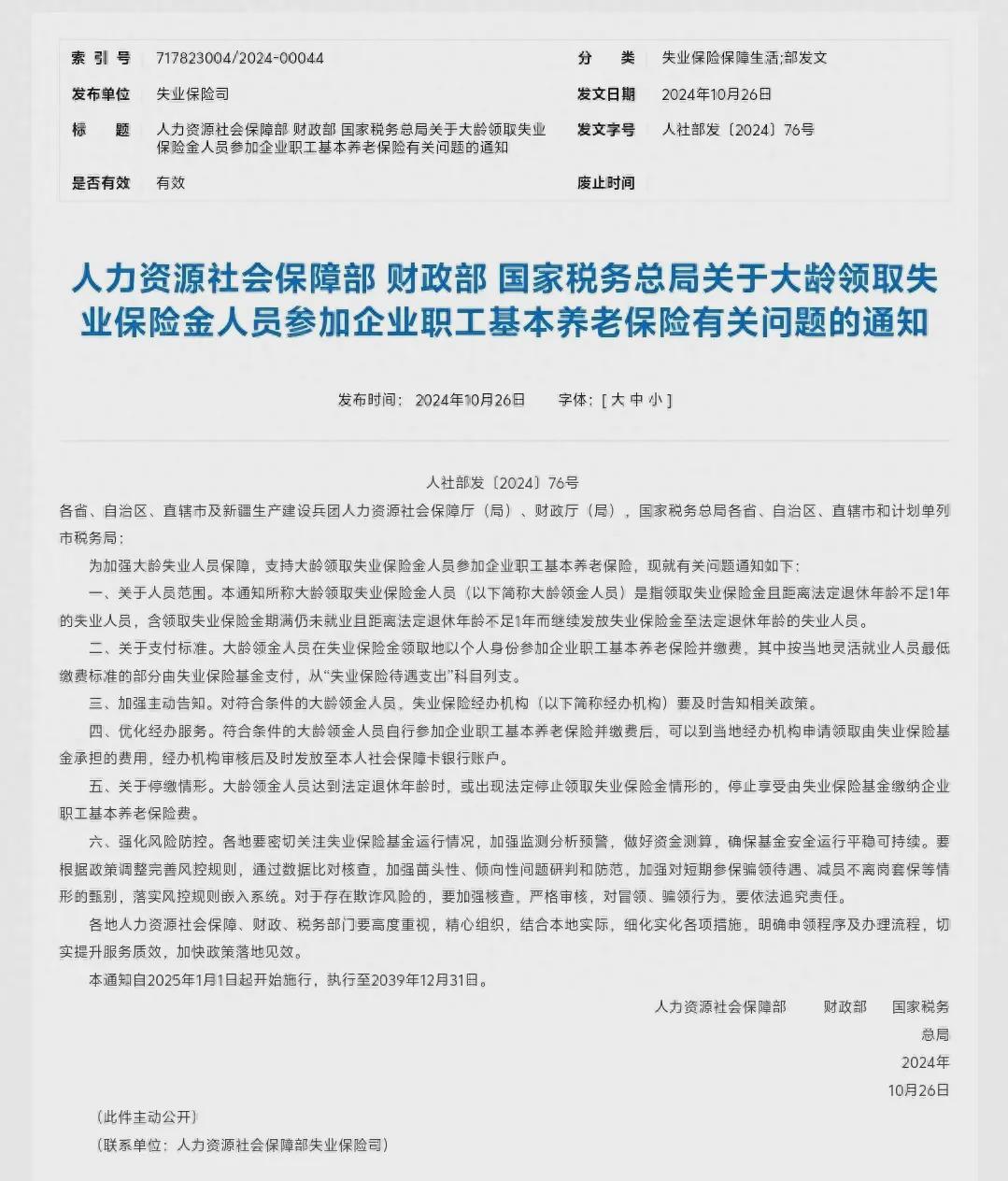 11月5日,人社部官宣,《关于大龄领取失业保险金人员参加企业职工基本养老保险有关问题的通知》出炉。