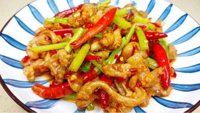 泡椒板筋是一道非常典型的黔菜,之前朋友从贵州旅游回来,问他最印象最深刻的一道菜是什么,回答不是预想中的宫保鸡丁、乌江豆腐鱼等,而是这道泡椒板筋。这道菜的主要选材料的是大猪通脊肉的内筋,加上独具贵州特色风味的泡椒。两者一同放入锅中烹饪爆炒,在烹饪时最主要的是对其现切、现腌、现炒。成菜后,辣甜鲜香,口感脆糯,开胃下饭。