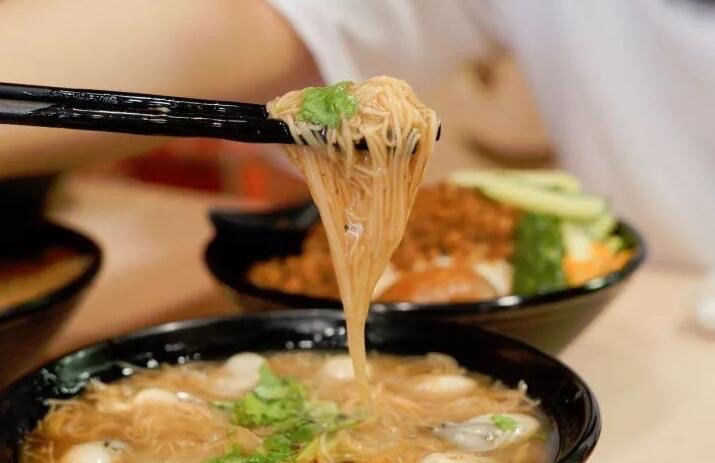 从一大锅如粥般浓稠的面条中舀上两勺,放上肥牛、海蛎煎、基围虾、土笋冻,这就是台北人每天早上赖以生存的面线。面线汤汁浓稠、入口顺滑、糯而不烂,一勺下肚,软糯的面线缠绕着浸满汤汁的虾仁,海味又为它带来了鲜美和清甜的口感,回味无穷。