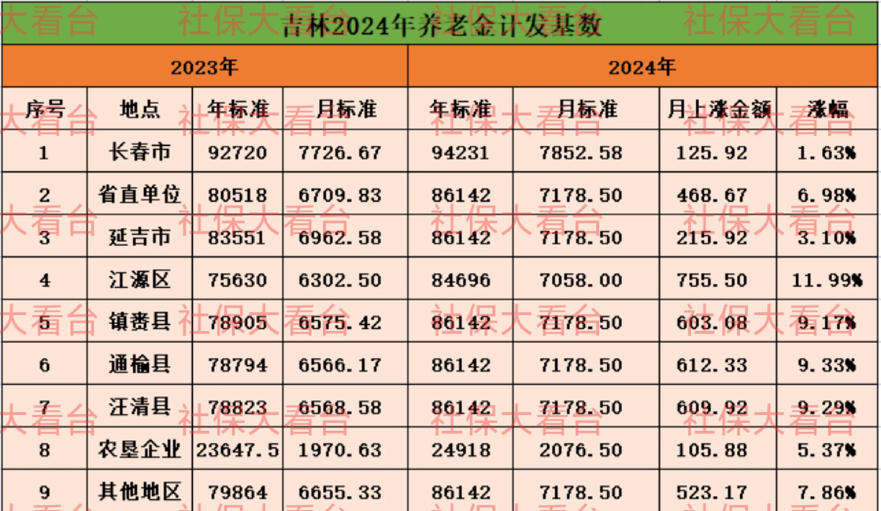 需要特别指出的是,吉林全省大部分地区2024年养老金计发基数采用的是上年度全口径城镇单位就业人员平均工资7178.5元,说明吉林的养老金计发基数距离全省统一为社会平均工资的脚步又近了一步。
