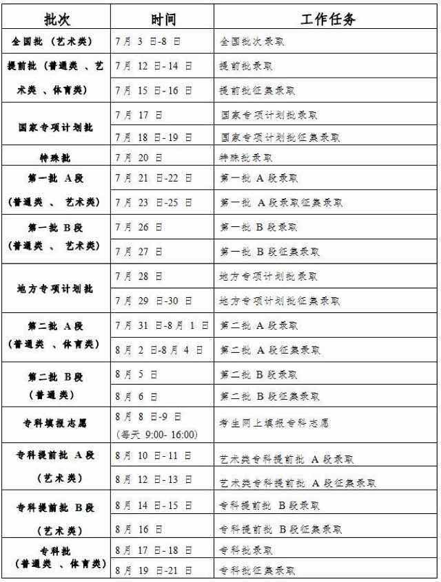 录取工作,共分3个批次进行,从7月9日开始至8月15日结束,各批次录取具体时间如下: