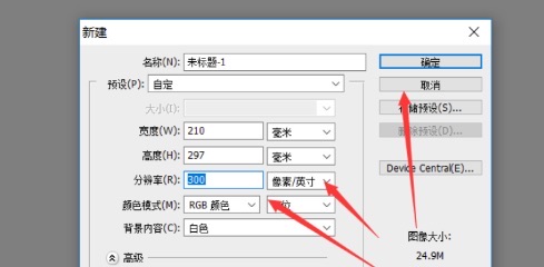 5.单击ps new后,无需在弹出的新对话框中直接单击以选择国际标准纸张,只需将宽度设置为210mm,高度为297mm,分辨率为300,然后直接单击“确定”即可。