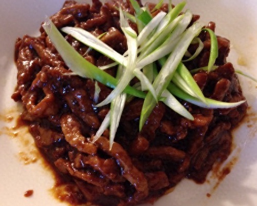 - ⑤:把调好的汁倒进锅里翻炒,肉丝变深色,放入大葱丝炒匀,出锅装盘。