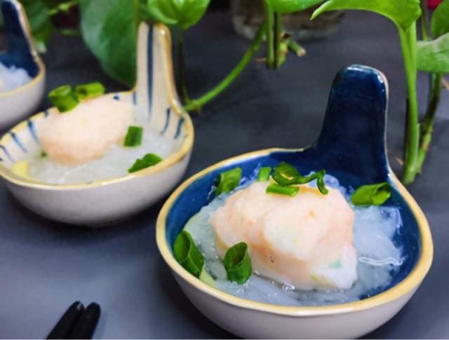 备用食材:白虾5个,蛋清半个,白萝卜1小节,淀粉10克,大葱1段,生姜几片;