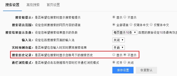 5、另外,如果你不想让百度自动记录你的搜索行为,你可以在上面第3步时取消“记录搜索行为日志”(如下图红色圆圈位置,取消即可);如果不想在百度搜索框显示历史搜索词的话,可以关闭“展现搜索历史词”功能(如下图红色方框圈中位置,取消即可)。#犯罪心理#