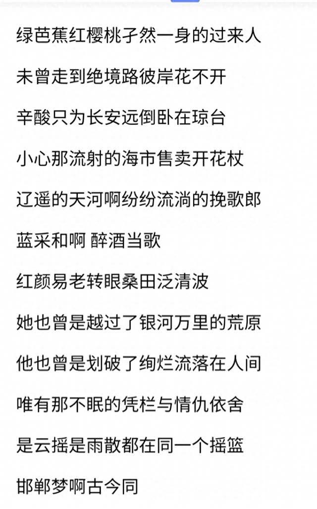 接下来刀郎写的应该是男女之情,一个穿越银河,一个划破绚烂相悦人间。【趣元素】#格雷#是云,瑶与散都在同一个摇篮,取自唐宋之问的云,瑶与散,各帆飞,海阔天长阴,信息,爱恨情仇,生死离别,皆是一场空闷主题。再回到当初红颜一老,容誉荣华一世。
