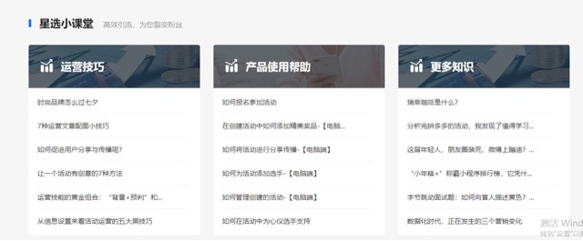 平台精选行业最佳学习干货和案例,不用买书积灰,不用百度查找,您最想看到的,最想学到的,我们都整理好了。关于运营:运营文章配图技巧、学习如何促进用户传播分享、怎么才能让活动有创意的七种办法、时尚品牌如何打造等等。关于产品使用,不想问客服或者先来无事可以学习,如何报名参加、如何在活动中添加精美礼品、如何添加选手、如何管理活动等。还有更多热点运营新闻,及时发布,运营不枯燥!