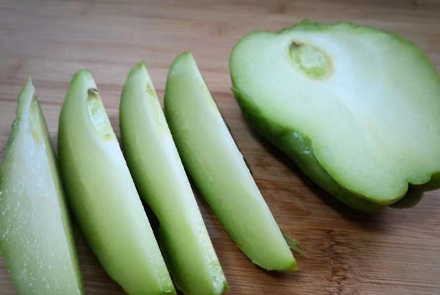2、佛手瓜洗净,把中间的那个果核去掉,(如果老可去外皮),切成条状。#泾渭分明#