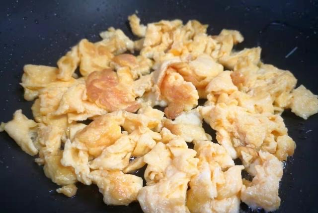 4、锅倒适量油烧热,倒入鸡蛋液,凝固后翻炒成鸡蛋块盛出,孩子喜欢炒鸡蛋老点,多炒了一会。
