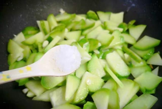 5、锅里倒入少许油继续加热,放入葱花煸炒出香味,加佛手瓜煸炒一会,炒至佛手瓜变软,加入适量食盐,鸡精翻炒断生。