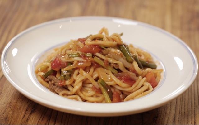 食材:面条适量、圆茄子1个、青椒1根、猪肉1块、洋葱半个、小葱1根、蒜4粒、姜1小块、盐半勺、酱油2勺、豆瓣酱1勺、蚝油1勺、鸡粉少许、水淀粉少量。