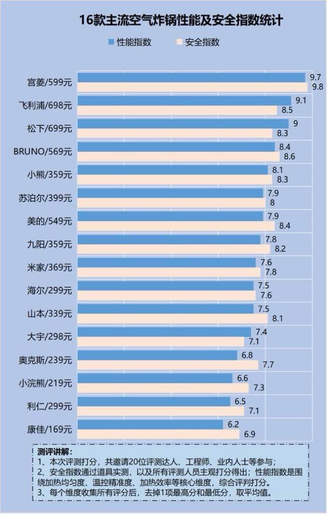 鉴于市面上很多商家都称自家产品质量好,但其实很多都是为了助销而宣传出来的,暗藏危害风险,这里特意给大家分享一张全网十大空气炸锅安全及性能评分图,供大家参考: