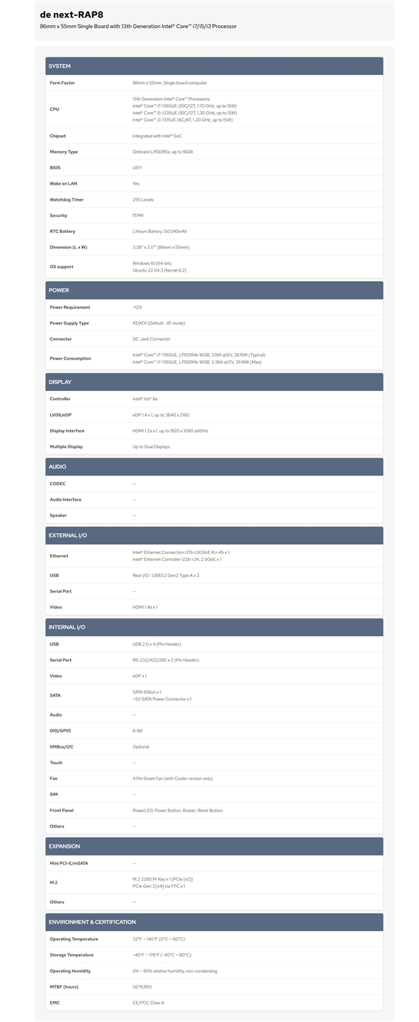 最多16GB LPDDR5X内存,Intel IL226M 2.5G、I219-LM 1G双网卡,一个M.2 2280 PCIe 2.0 M-Key SSD插槽(也可用于Wi-Fi/4G无线模块)或通过FPC支持PCIe 3.0 x4、一个SATA 6Gbps接口,以及各种各样的工业级功能。