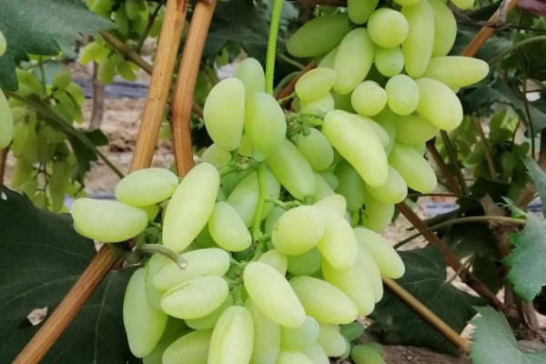 金手指葡萄属欧美杂交种,果穗巨大,长圆锥形,松紧适度,平均穗重750克,最大穗重1500克。果粒形状奇特美观,长椭圆形,略弯曲,呈弓状,黄白色,平均粒重8克,疏花疏果后平均粒重10克。