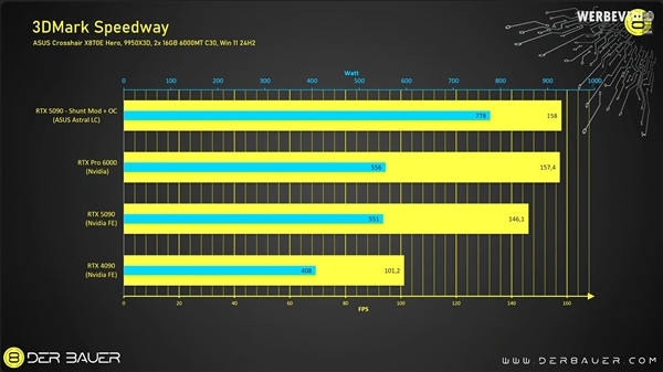 随后其又通过使用GPU Tweak III进一步推高GPU电压,功耗接近800W,性能更是达到了158FPS,超越了售价超过10000美元的工作站级RTX 6000 Ada显卡。