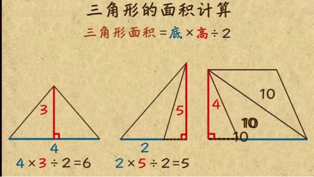 三角形的面积公式为:S=1/2×ah。其中,a是三角形的底边,h是底边所对应的高。三角形是由同一平面内不在同一直线上的三条线段“首尾”顺次连接所组成的封闭图形,在数学、建筑学有应用。